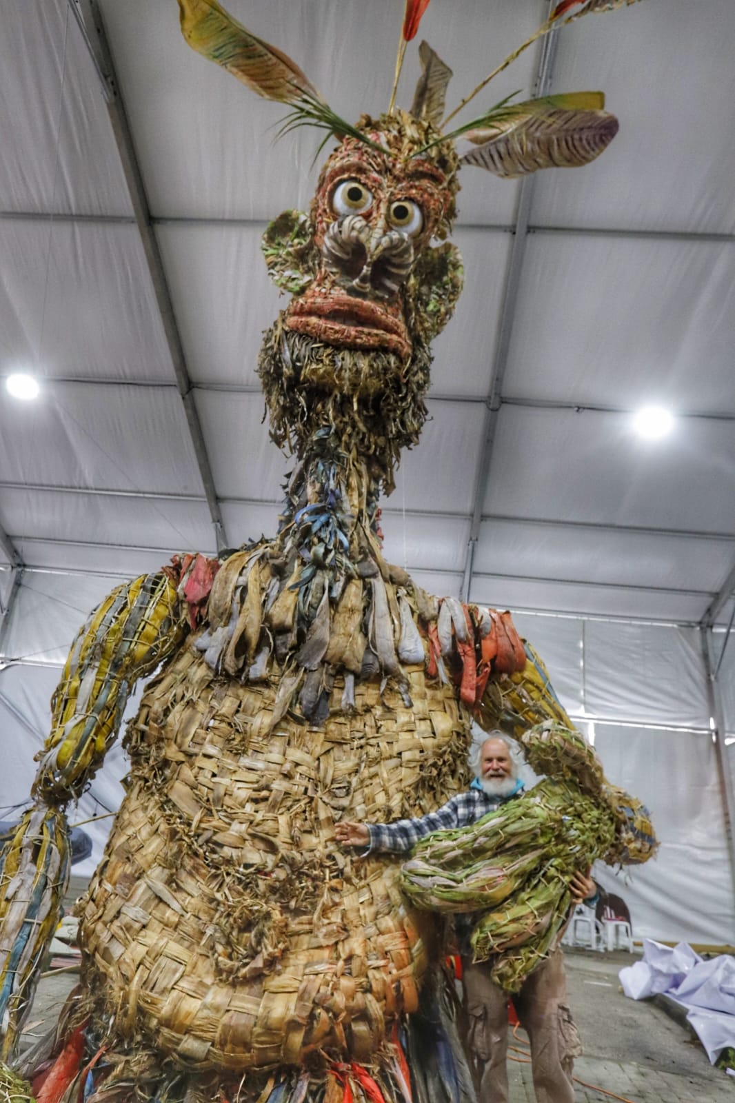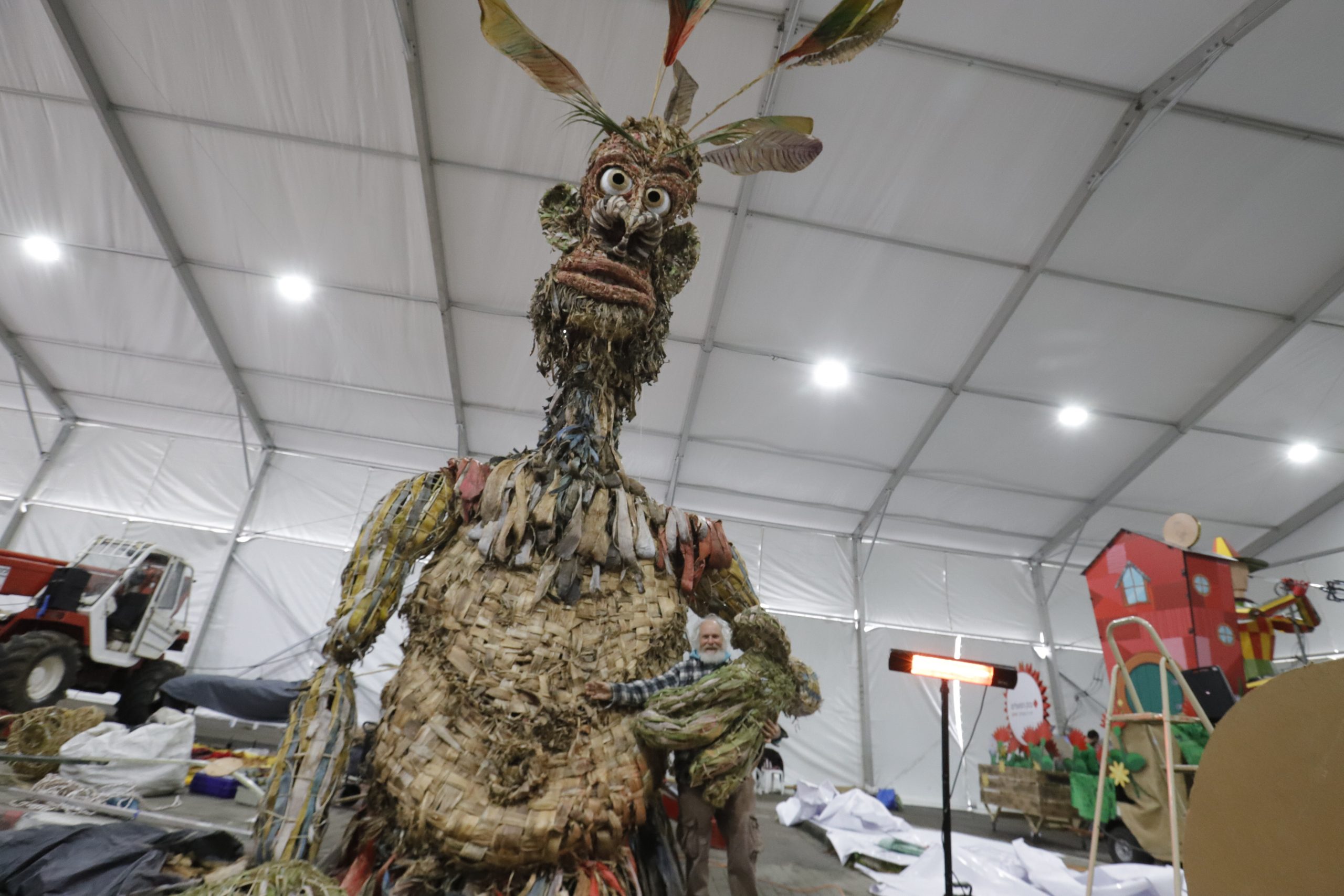 אבל בואו נחזור לרגע לקסם שפגשתי אך לפני כמה ימים . במרכז האוהל ניצבה דמות שקשה היה להסיר ממנה את העיניים: ענק המתנשא לגובה של כמעט עשרה מטרים, עשוי כולו – עד הסיב האחרון – מחומרים צמחיים. זהו המיצג של ידידי, הבובנאי והליצן אדם יכין. עבור אדם, יליד ירושלים, הבובה הזו היא לא רק מיצג, היא פיסת חיים.