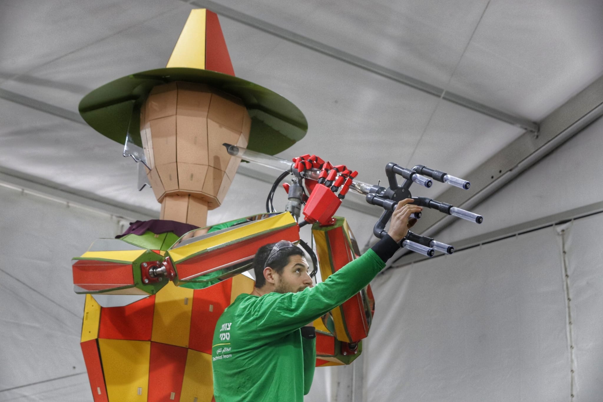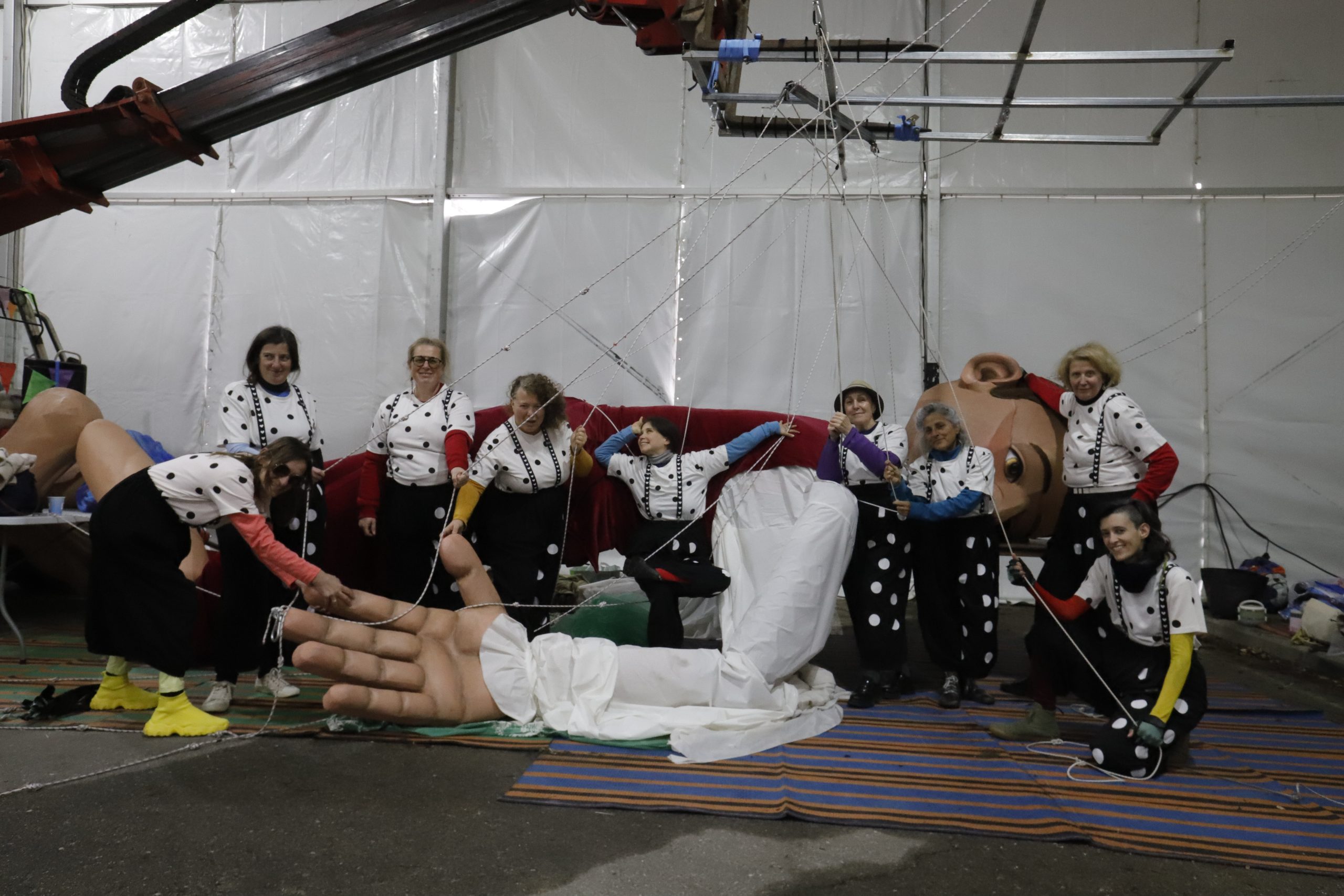 קוזין עמדה באחת הפינות עם שבע נשים לבושות בבגדים נקודתיים, נראות כמעין מקהלה יוונית מודרנית, כשהן עומלות סביב ראשו הענק של גוליבר המחובר למערכת חוטים ומנופים. זוהי מלאכת מחשבת של פיסול והנדסה. במקום אחר, ראיתי אמנית צעירה מפסלת בתוך גוש לבן של חומר מוקצף, מעצבת תווי פנים של ענק שנדמה כי הוא עומד להתעורר לחיים בכל רגע. האור האדום שנפל על הפסל העניק לו מראה חי, כמעט אנושי.ראיתי גם את המפגש בין הטכנולוגיה לאמנות במיצג המבוסס על פינוקיו, שם אמן בחולצה ירוקה כיוון מנגנון של צינורות PVC המחוברים לזרוע עץ רובוטית. זוהי דמות גיאומטרית, צבעונית, שמשלבת את קסם העץ עם הדיוק של המכונה.