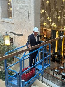 העבודות על הסוכה החלו כבר לפני מספר שבועות, בהובלת צוותי מהנדסים, אדריכלים ומעצבים אשר גיבשו את התכנון ההנדסי, אמצעי הבטיחות והעיצוב הייחודי. בחלל הסוכה עשרות שנדלירים יוקרתיים, קירות הסוכה מעוצבים בבדים בתפירה המותאמת אישית למלון, וכל פרט ופרט מותאם לסטנדרט האירוח הגבוה של וולדורף אסטוריה. צוותי התקנה מיומנים החלו הבוקר לעבוד מהגג באמצעות חבלי סנפלינג כדי לחזק את הסכך הענק בעשרות כבלי מתכת וקורות עץ, עד לרמת גימור מושלמת.